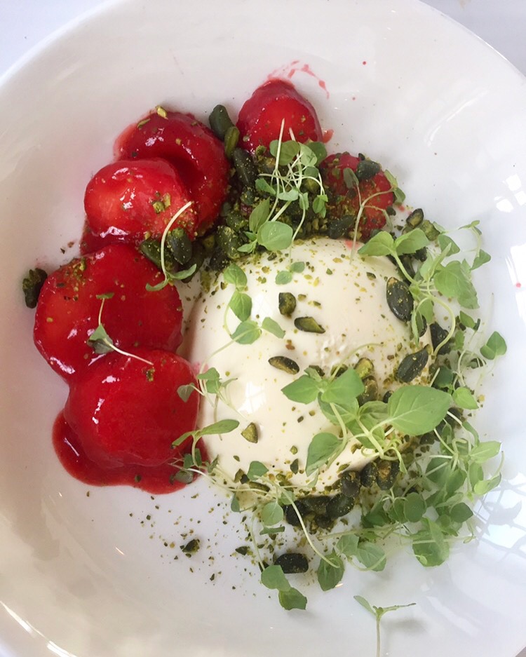 Finally after all these years we came around to trying out Bistrotheque hidden in the back alleyways of Cambridge Heath, East London in a minimal warehouse. It’s an intriguing, nondescript entrance leading into a cool, light, spacious dining room. Great service and atmosphere & all the food was delicious too … Straight to the point … the dessert was a Pannacotta with fresh strawberries in coulis and with micro greens added to, it was to die for!