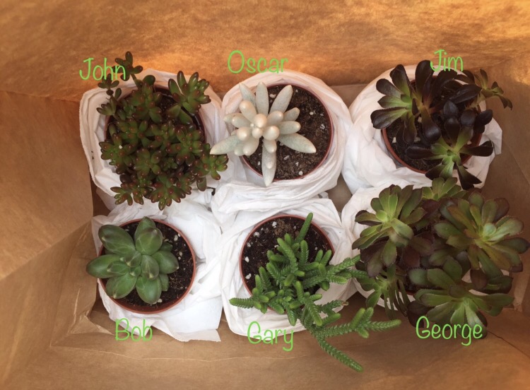 Gary, Bob, George, John, Jim & Oscar were carried home in a brown paper bag and are still going strong! Our indoor garden was made up of miniature succulents, cactuses & three ivy plants who we named Princess Jasmine, Marie José & Lucy Liu. Sadly the ivy girls didn’t survive long but the boys are still going strong.