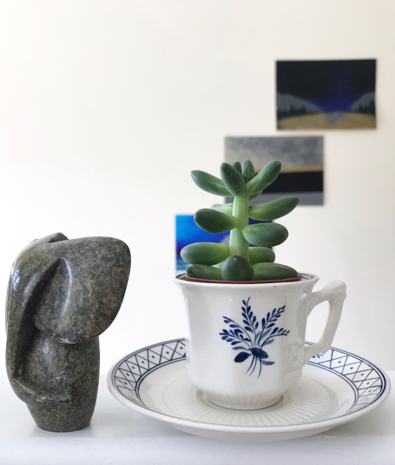 We didn’t want our plants to be just sitting on a shelf all ordinary, we wanted them to have their own individuality so we went on another treasure hunt through the local stores and found them all their own original antique teacups to show themselves off to the best that they could! We totally feel that the plants have turned our house into a home. After all plants are living things so they add more life to our already lively lifestyle 🙂